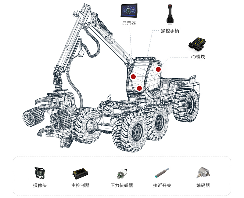 伐木机主要有两部分构成:底车与机头。这两部分均可配置相应的电控系统,该系统支持视频监控、数据对比分析、定位追踪、实时车况以及触摸控制的功能。基于系统的优化设计,简化连线,使得操作更加便捷,同时系统配置自动退料功能,提高了精度。